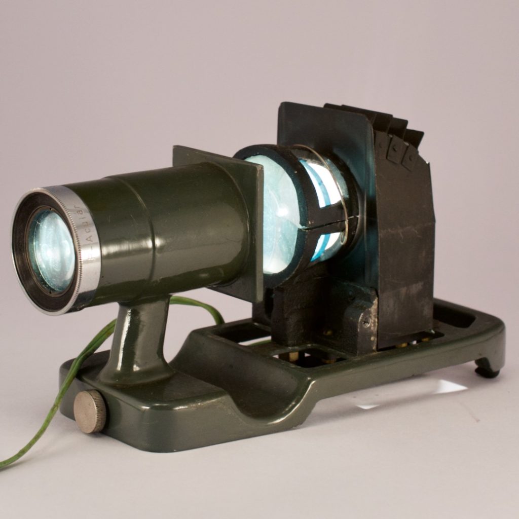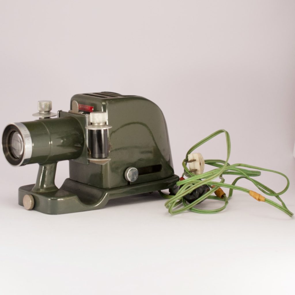 この商品はまだストアに掲載しておりません。スライド映写機です。箱に「Birdie FUJI PHOTO FILM CO.,LTD.」と記載されております。ランプは切れておらず点灯します。懐かしいアイテムです。眺めているだけで時間の経つのを忘れます。「Birdie FUJI」のキーワードで検索しましたところ、富士フィルムのサイトがヒットしました。これによりますと、このアイテムは1951年(昭和26年)1月に発売されましたスライド映写機“バーディー1型”のようです。「防熱ガラスでフィルムのカールを防ぎ、色収差の少ない“レクターP”レンズを装着」と記載されています。