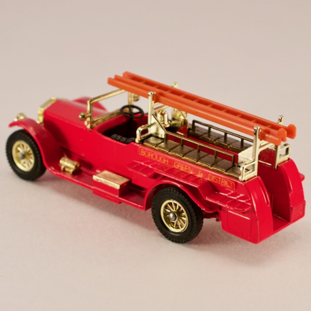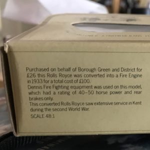 このロールスロイスは1933年にグリーン郡とその地域向けに26ポンドで購入され、100ポンドかけて消防車に改造されました。この車には40馬力〜50馬力のデニス社の消防装置が搭載されております。ブレーキは後方のみです。この改造ロールスロイスは第二次世界大戦中、ケント地区にて多方面で活躍しました。