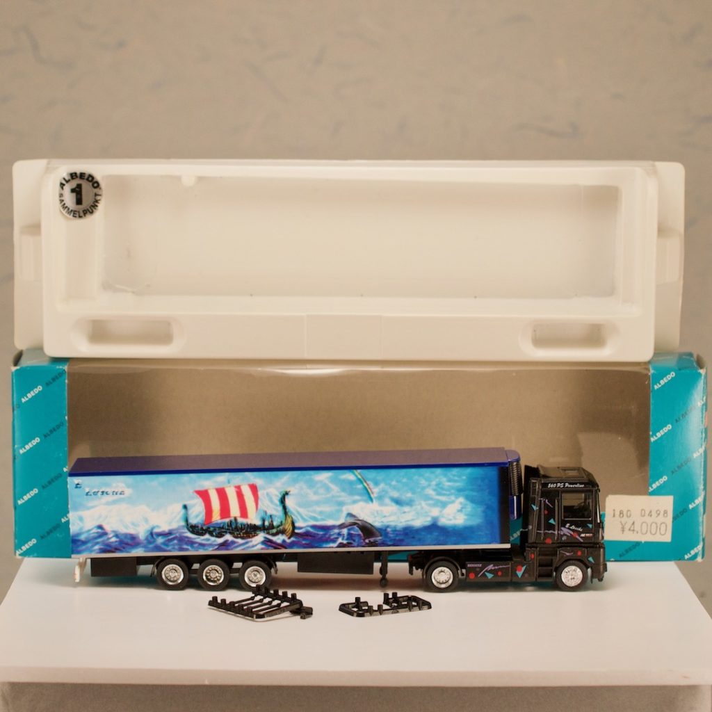 本日、ドイツ国アルベド(ALBEDO-FORKEL)社のトレーラー(GOTTMANNSDORFER WEG 11)をストアに商品登録しました。ダイキャストではなく樹脂製です。冷凍車です。バイキング船の印刷がとても綺麗です。